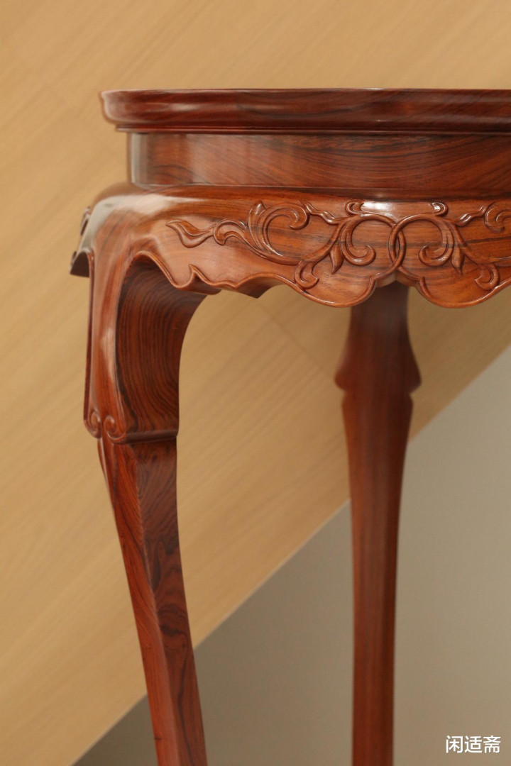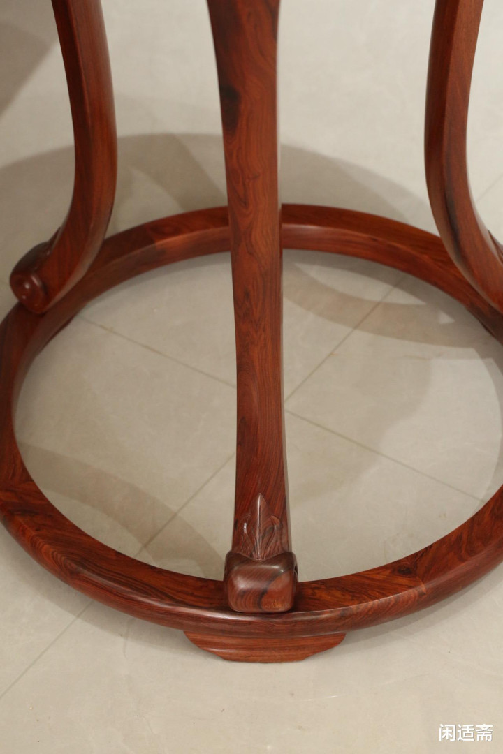 几面制作工艺雷同顾忌,选拔整挖制法的中枢工艺理念,以四段弧形大边攒成圆框,弧度精确流通,拼接处严丝合缝。圆框内侧打槽,精确装入面心板,面心板纹理应然舒展,与边框曲直分明;几面立面经心作念成冰盘沿线脚,线条档次丰富,过渡当然柔柔,触感顺滑密致,尽赫然式产品的细节之好意思。直束腰谋划简易规整,束腰之下肩部微微彭出,与牙子以插肩榫相交,让各部件联络更显合而为一。