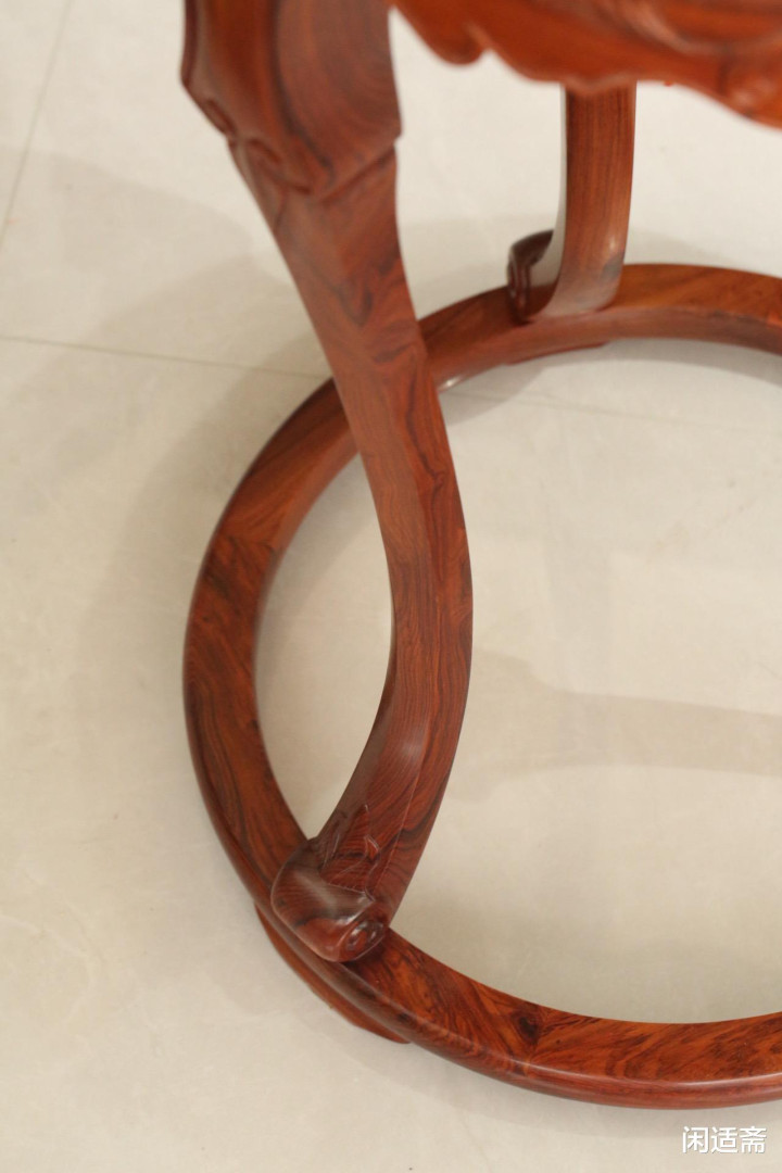 此香几最具特质的等于其经典的三弯足造型,搭配带托泥的谋划,尽赫然式产品的灵动与正经。腿足先向内管理,随后向外优雅翻出,因线条细劲修长,明东谈主演义及清代则例中便有“蜻蜓腿”的雅称,既赋予香几眇小洒脱之态,又保险了合座结构的踏实性。足端精雕成花叶造型,纹饰密致生动,为简易的器型增添了几分好意思丽韵味;阁下端出榫,与带小足的圆托泥紧密相交,托泥不仅进一步踏实了器身,更让香几合座比例愈发合作,尽显谋划巧想。