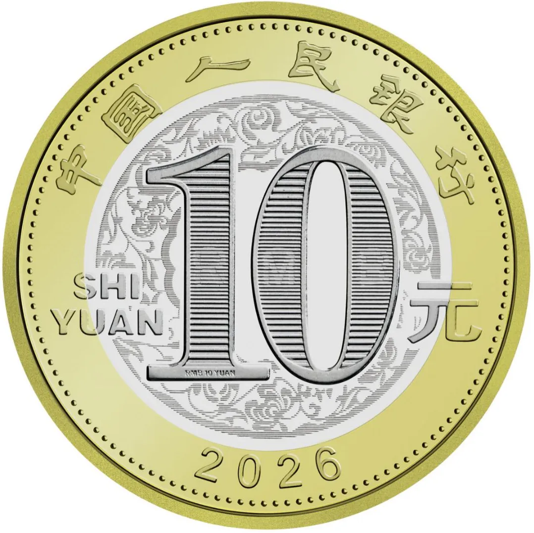 双色铜合金记忆币正面图案为“中国东谈主民银行”、“10元”字样,汉语拼音字母“SHIYUAN”及年号“2026”,底纹衬以团花图案。