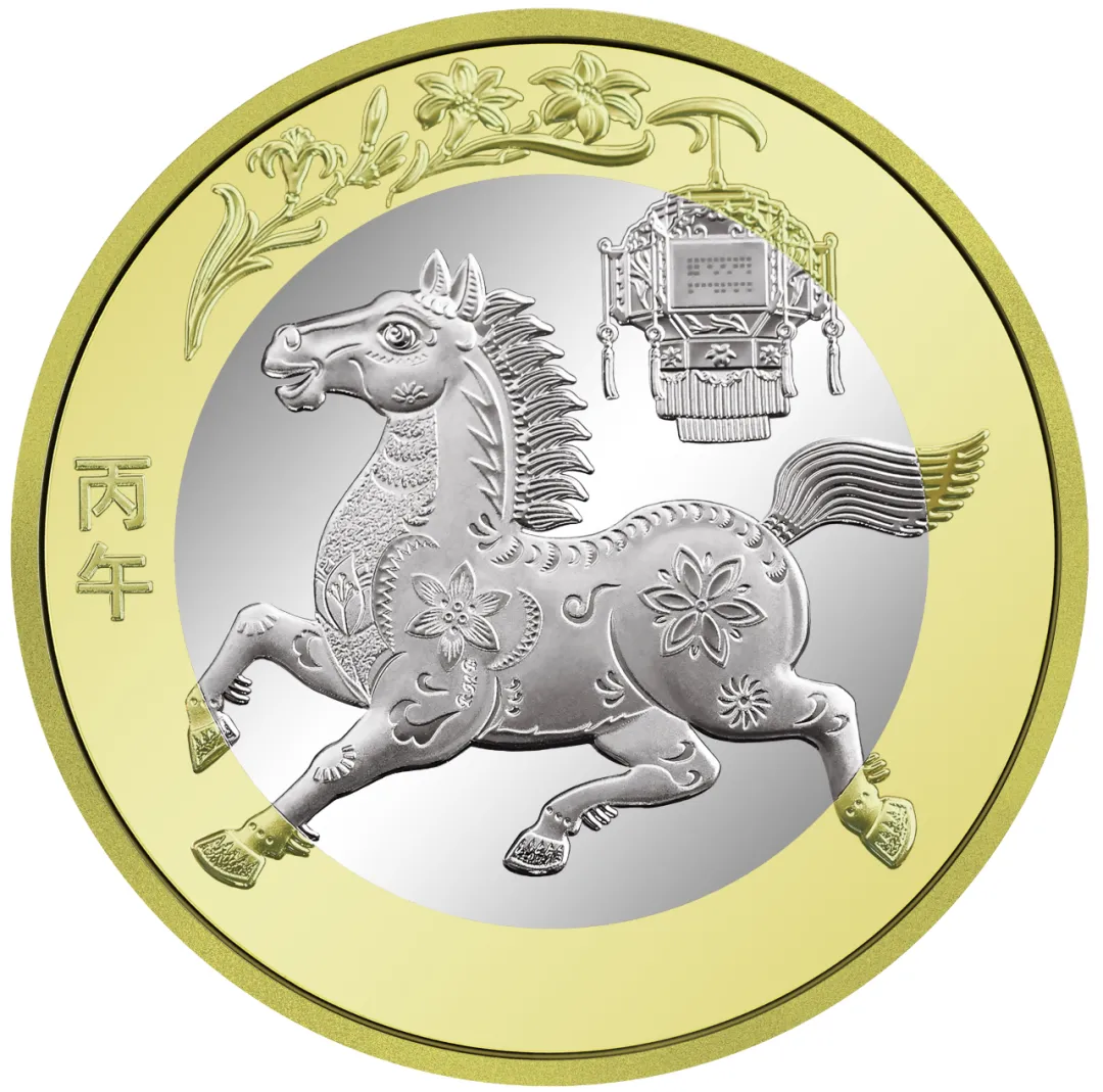 双色铜合金记忆币后面图案为中国传统剪纸艺术与遮拦年画元素联贯合的马形象,衬以花灯和萱草图案,币面左侧刊“丙午”字样。
