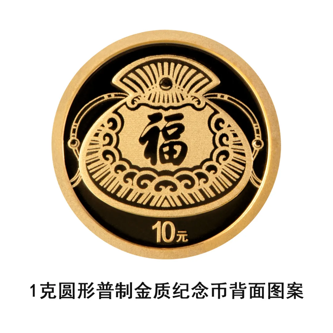1克圆形金质记忆币后面图案为“福”字、荷包组合野心,并刊面额。